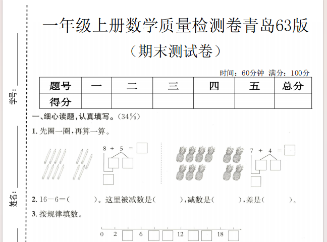 【小学数学】25秋一年级(上)数学期末质量检测卷2《青岛63版》