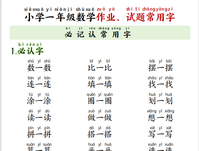 【小学数学】25秋一年级上册(上)数学必记认常用字