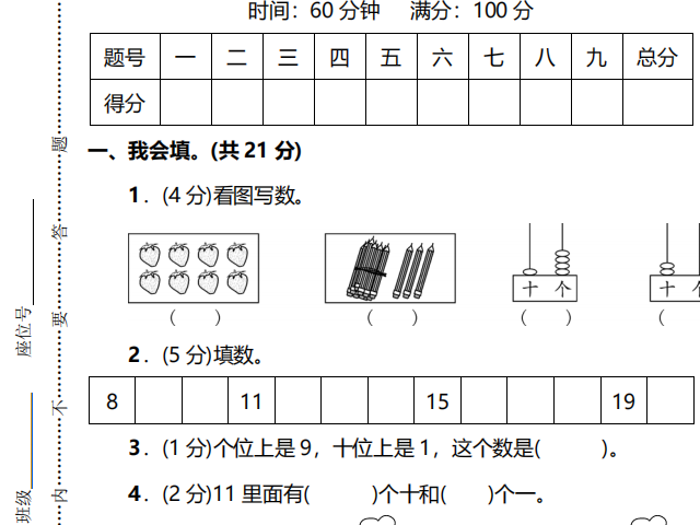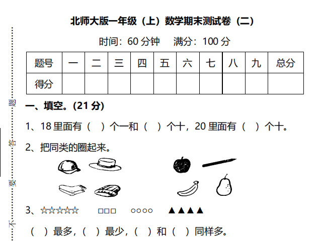【小学数学】一年级上册期末测试卷(三)及答案(北师大版)