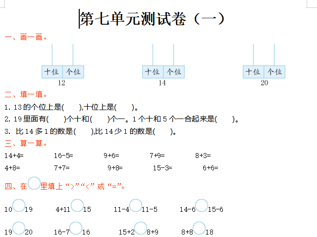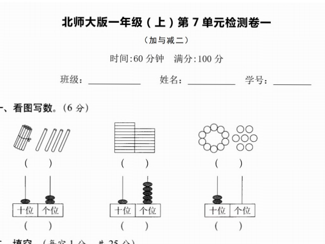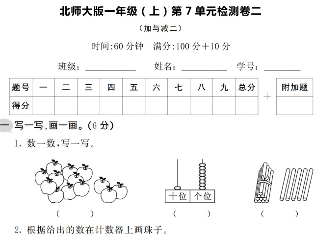 【小学数学】一年级上册_第7单元测试卷(一)(北师大版)