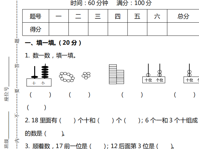 【小学数学】一年级上册第一单元 检测卷二(北师大版)
