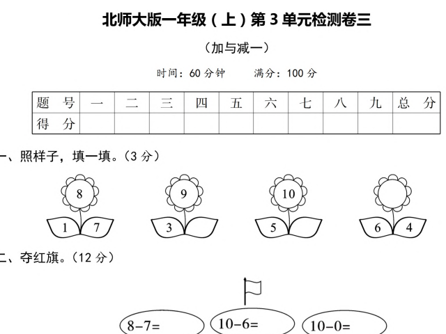 【小学数学】一年级上册_第8单元测试卷(一)(北师大版)