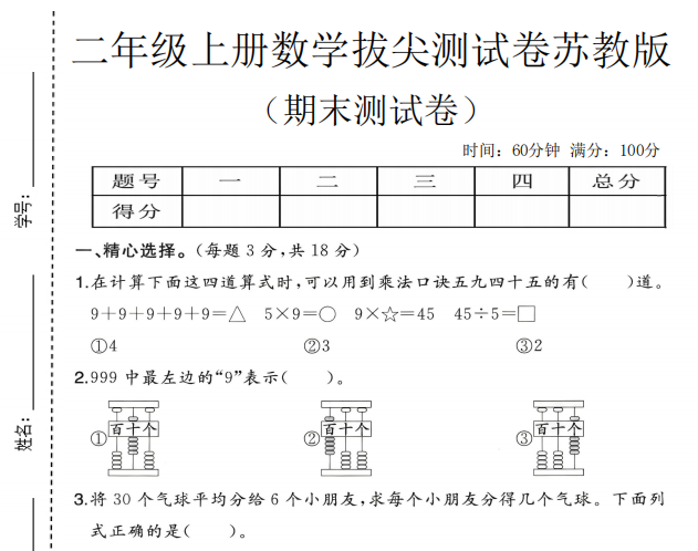 【小学数学】25秋二年级(上)数学期末拔尖测试卷9《苏教版》