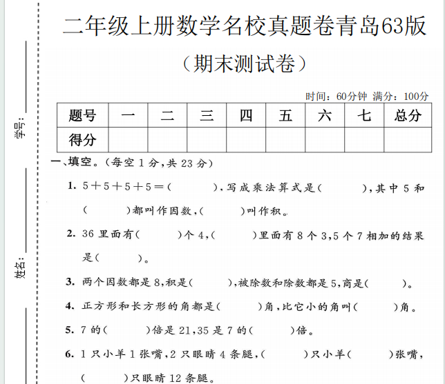 【小学数学】25秋二年级(上)数学期末名校真题卷2《青岛63版》