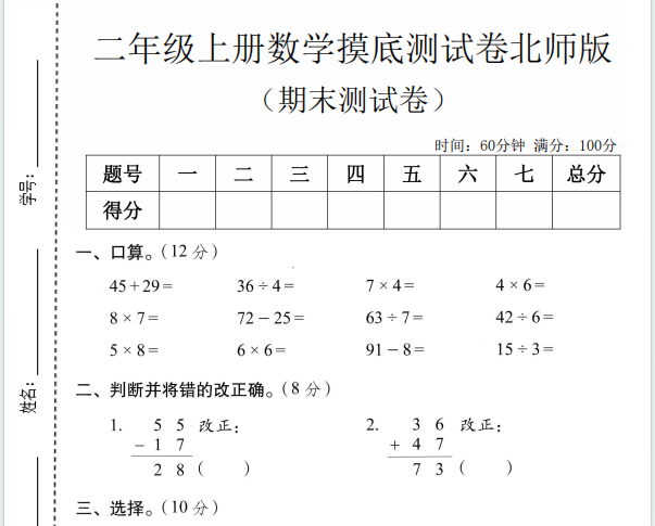 【小学数学】25秋二年级(上)数学期末摸底测试卷1《北师版》