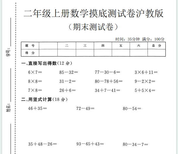 【小学数学】25秋二年级(上)数学期末摸底测试卷1《沪教版》