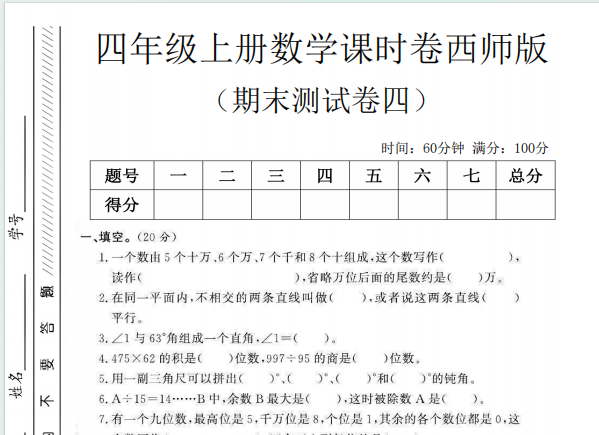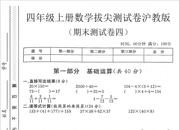 【小学数学】25秋四年级(上)数学期末测试卷4《沪教版》