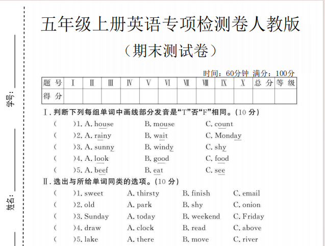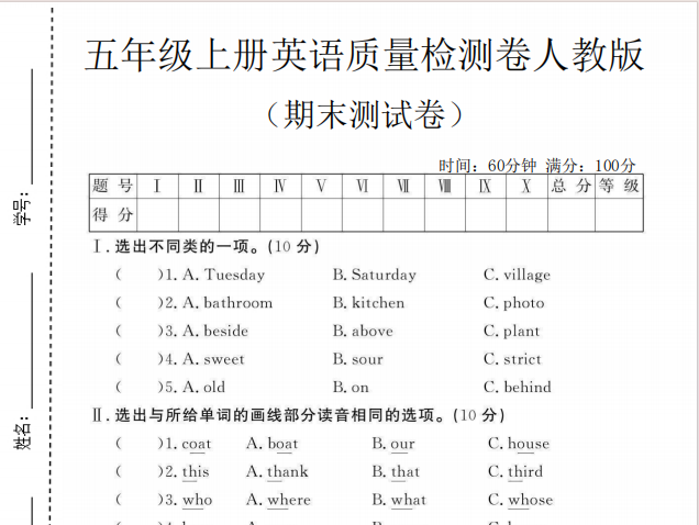 【小学英语】25秋五年级(上)英语期末测试卷1《人教版》