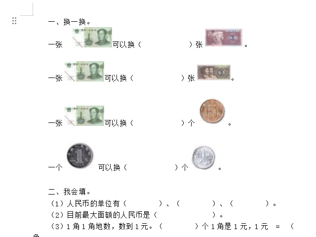 【小学数学】一年级下册32 人民币单位间稍复杂的换算(北京版)