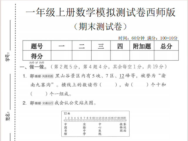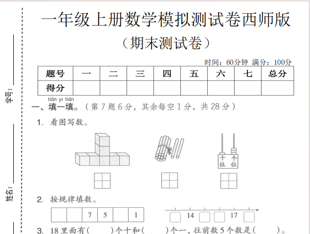 【小学数学】25秋一年级(上)数学期末模拟测试卷1《西师版》