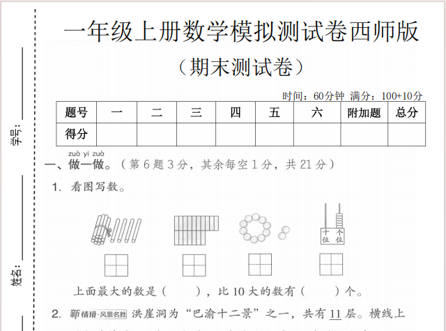 【小学数学】一年级上册期末测试卷1(含答案)(西师大版)