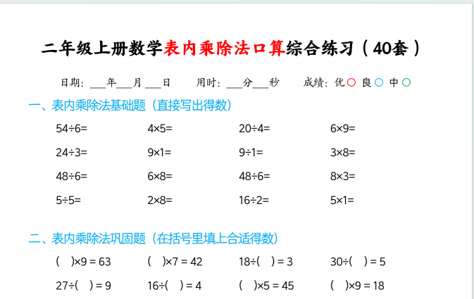 【小学数学】25秋二上数学表内乘除法口算综合练习题40套40页