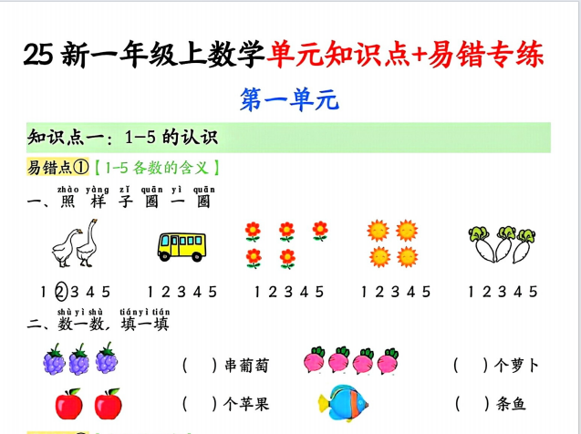【小学数学】25秋一上数学单元知识点+易错专练(含答案15页)