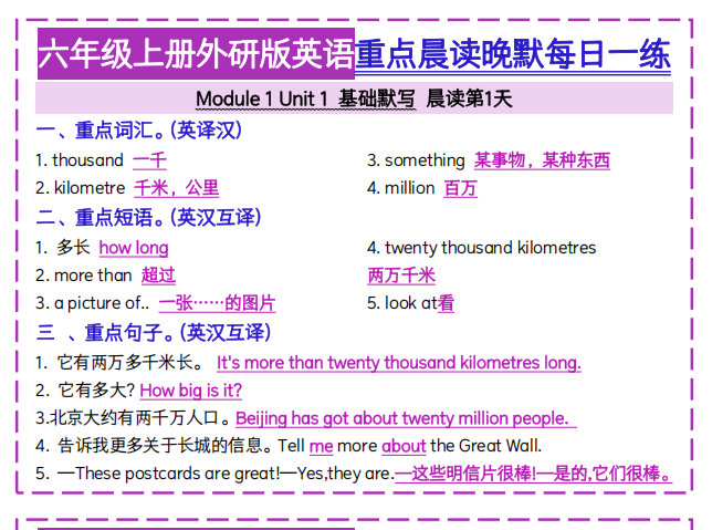 【小学英语】25秋新六上外研版英语重点晨读晚默每日一练(20页)三起点