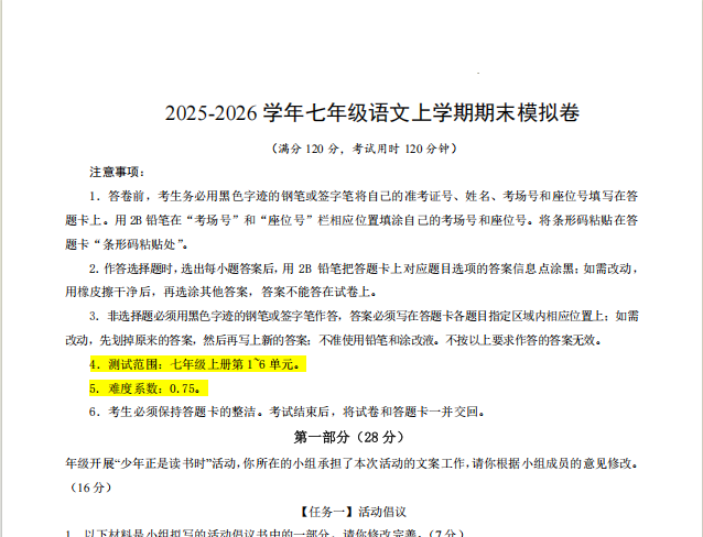 【初中语文】25秋七年级(上)语文期末模拟卷02