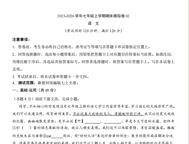 【初中语文】25秋七年级(上)语文期末模拟卷02(1)